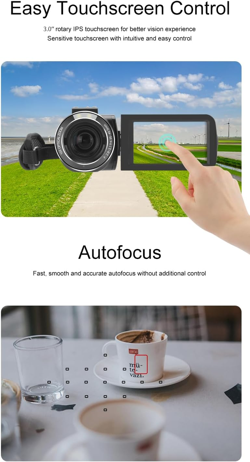 - Fully Auto Focus for Efficient & Close-up Shots: The camcorder features rapid auto-focus,capturing clear shots of objects from 5 cm to 50 cm—surpassing the typical challenge of cameras struggling to focus within 1 meter. The 2-in-1 tripod serves as a handle or tabletop tripod,ensuring stability and versatility. Additionally,the vlogging camera is equipped with high-brightness LED white light to enhance lighting in low-light environments.