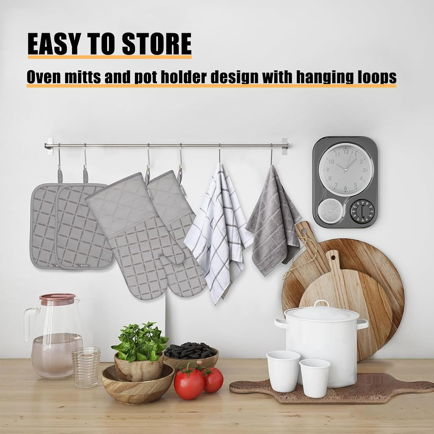 • HANGING STORAGE & EASY WASHING: Each item of the set is designed with a hanging loop for easy storage. You can hang it up after each use. You can even throw the kitchen mitts and dish towel sets in the washing machine if you are not available.