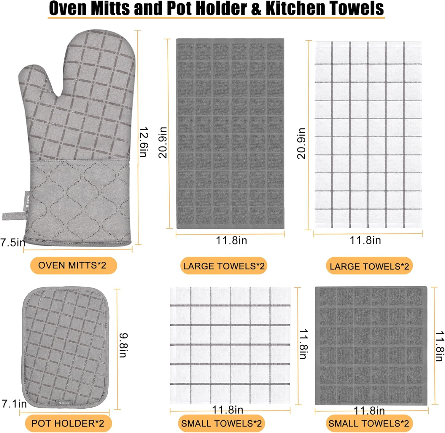 This oven mitts with towels sets comes with 2 pcs oven mitts set/2 pcs pot holders/4 pcs large kitchen towels/4 pcs small dishcloths.