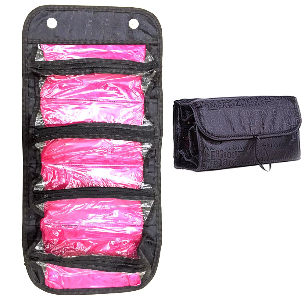 - Toiletry case with 4 multi-compartment zippered clear pockets to see items quickly; 10″ x 20″ Flat, 10″ x 5″ Rolled
